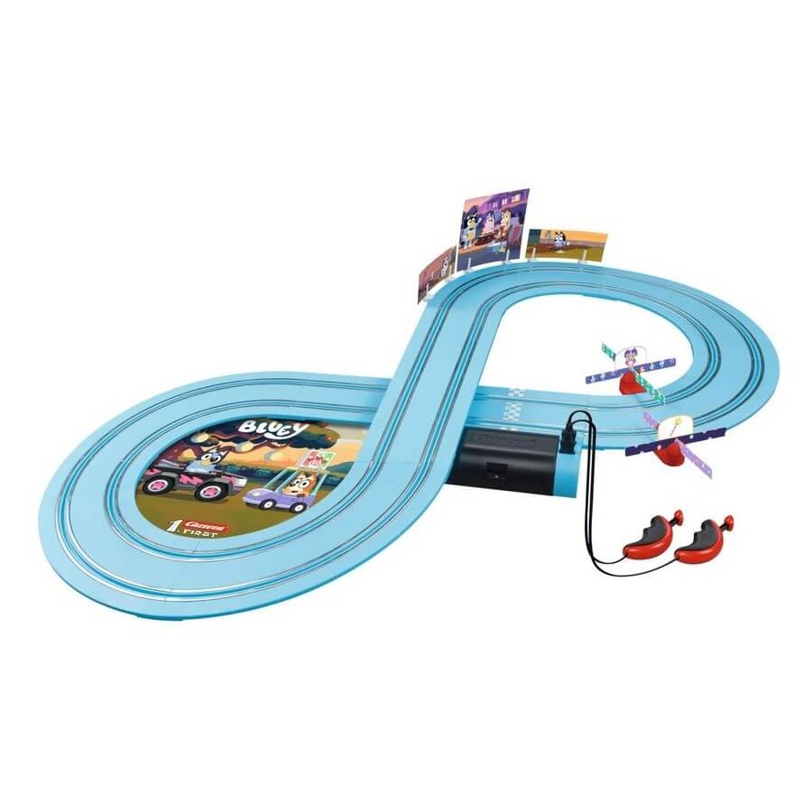 Bring Bluey and Bingo to life with the Carrera First Bluey Let's Go 2.9m Slot Car Track Set. Designed for preschoolers, this officially licensed race track features kid-friendly controllers, safe speeds, and durable build quality for worry-free family fun.