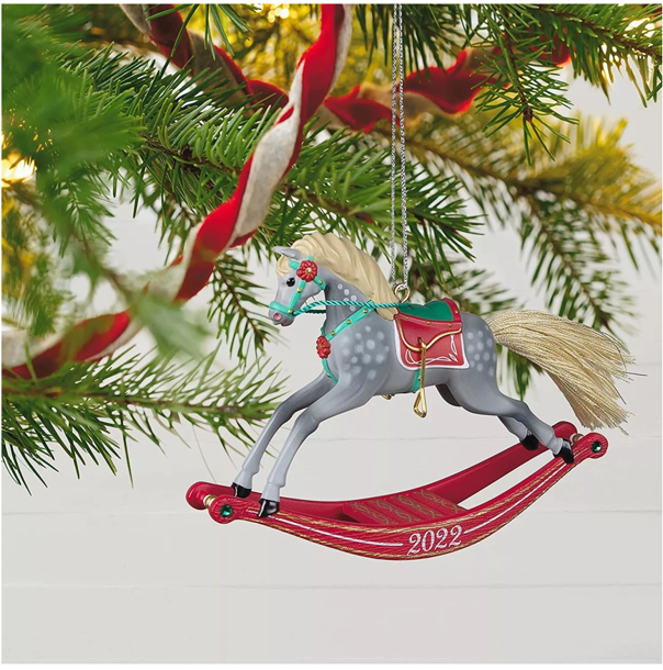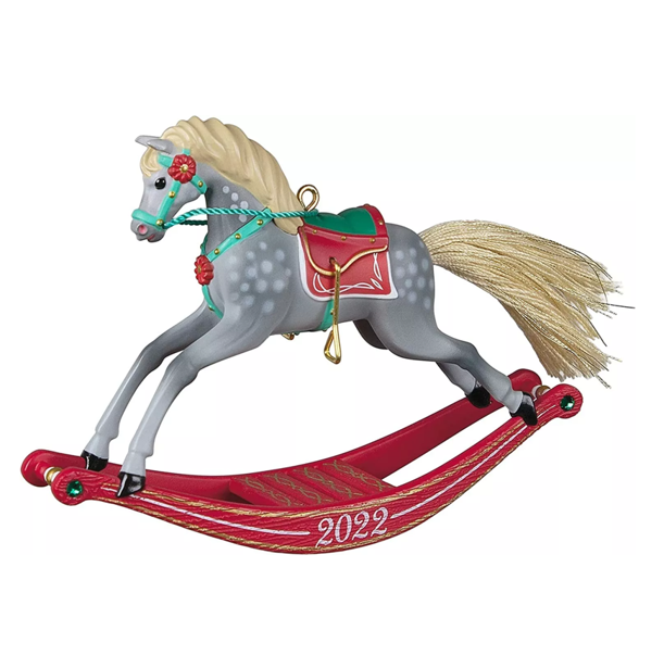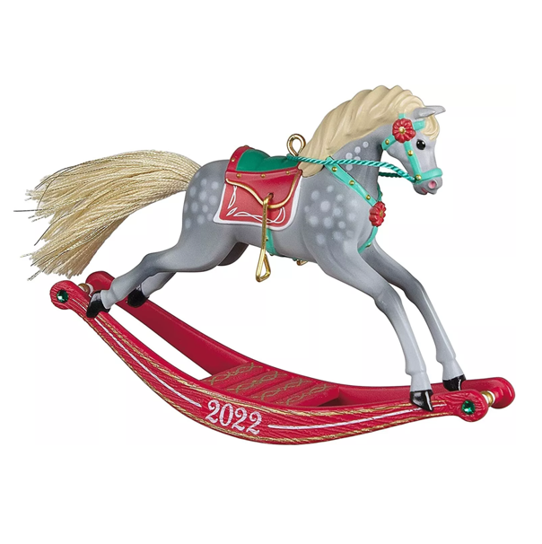 This beautiful Christmas tree ornament features a dark dapple gray horse with a rich beige and gold yarn tail and emerald green gem accents on the rocker. Year dated 2022.
