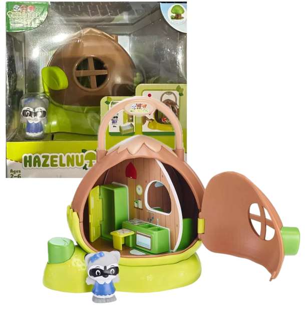 An entire house inside a little hazelnut... What could be more magical? Open up the big front door to reveal a delightfully detailed interior. Then, press the button to explore the three different rooms.