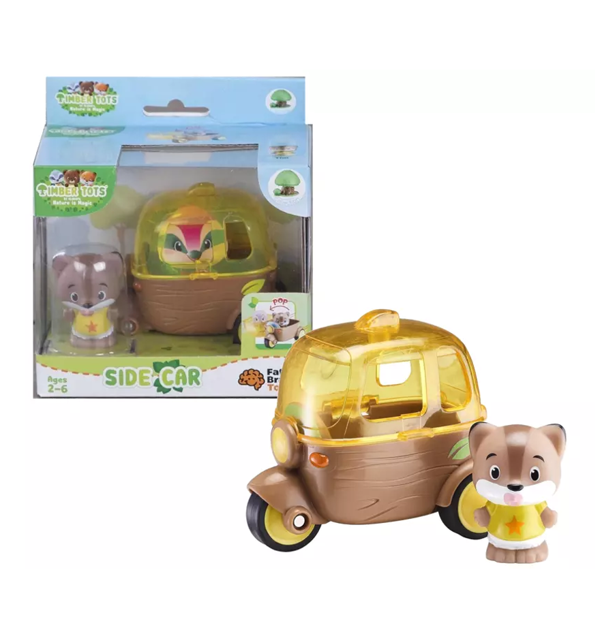 Meanwhile, the transparent top opens up to reveal a space for a little forest critter driver, plus the top transforms into a sidecar with a peg for holding a second forest critter. No matter where you need to go, you're sure to get there right on time with the Timber Tots Side Car!