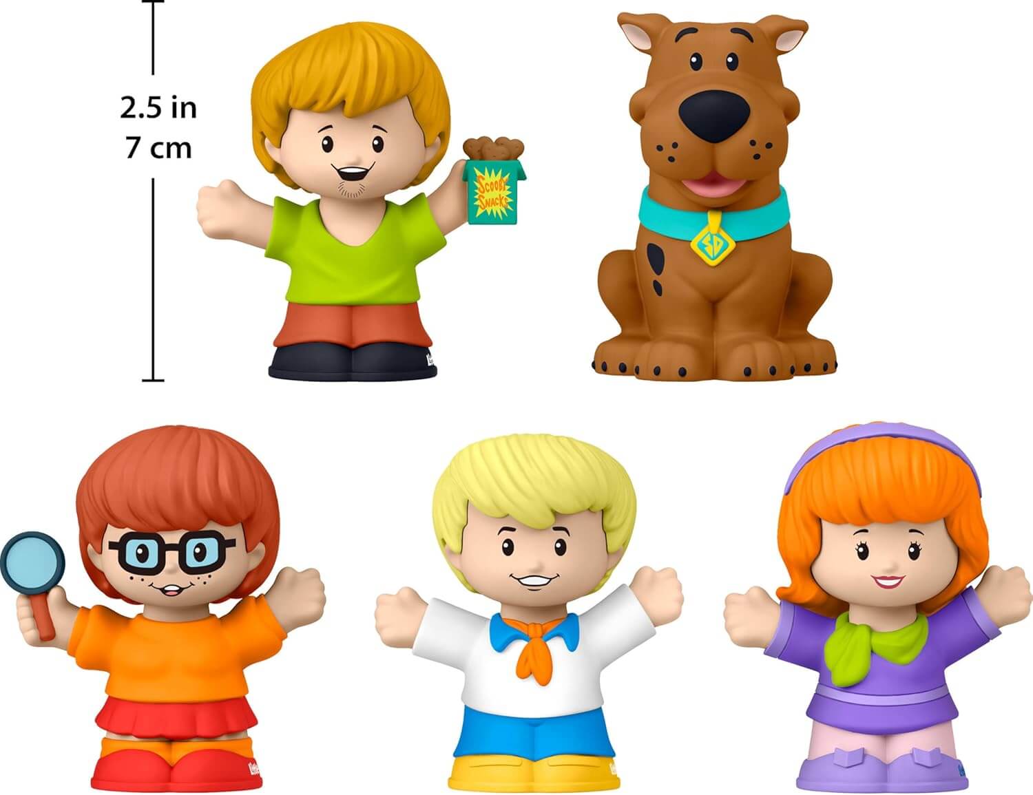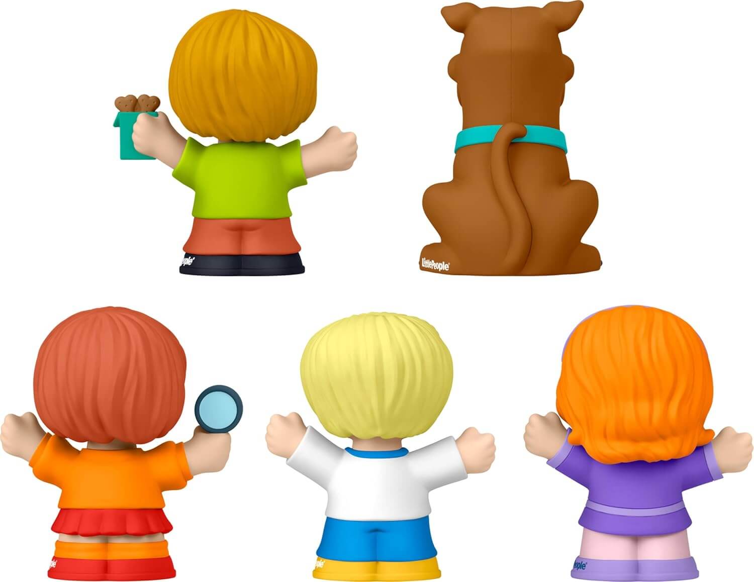 This collectable figure set includes all 5 members of the Scooby Gang reimagined in signature Little People style — Scooby, Shaggy, Velma, Daphne, and Fred, each styled in their character's signature look from the series.