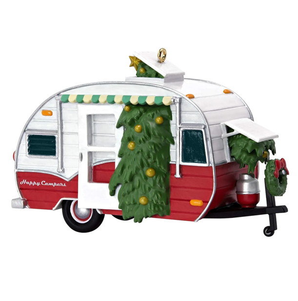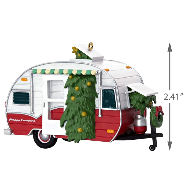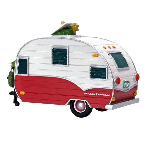 Delight their sense of adventure with the decoration's nostalgic and humorous details, like the awning, windows, Christmas wreath and a giant, decorated Christmas tree shoved into the tiny camper.