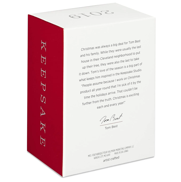Artist crafted by Tom Best, this Christmas tree ornament comes pre-packaged in a box for easy gift giving, preservation and storage. Dated 2019 in copyright.