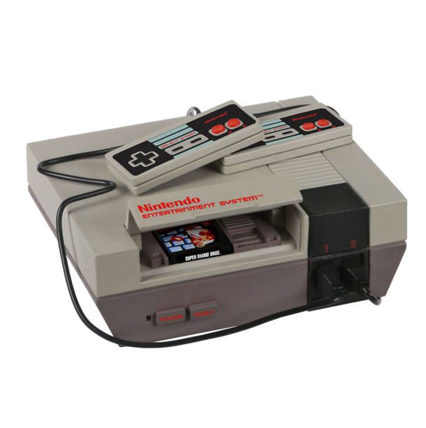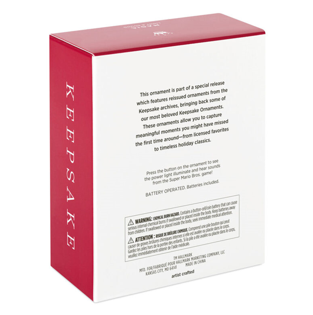 Nothing mattered except defeating Bowser and ultimately completing the entire "Super Mario Bros." game. Relive the care-free fun when you display this classic Nintendo Entertainment System console Christmas tree ornament that lights up and plays the familiar music and sounds of the iconic video game (battery-operated).