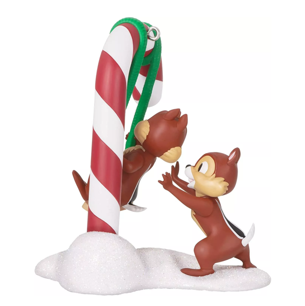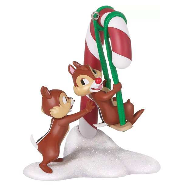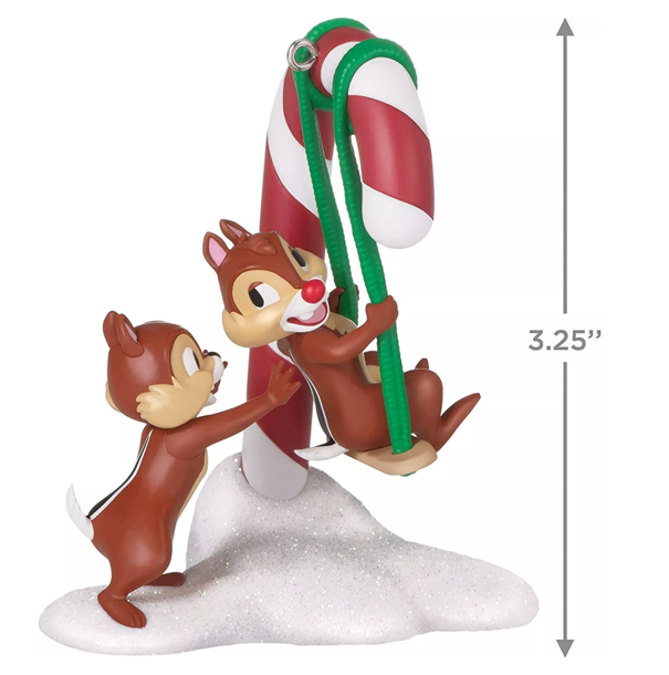 In this festive Christmas tree ornament, Chip pushes Dale on a swing hanging from a candy cane that's anchored in a snowbank. The playful decoration featuring the iconic pals makes a great holiday gift for a special friend and Disney fans of all ages.