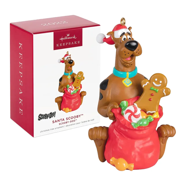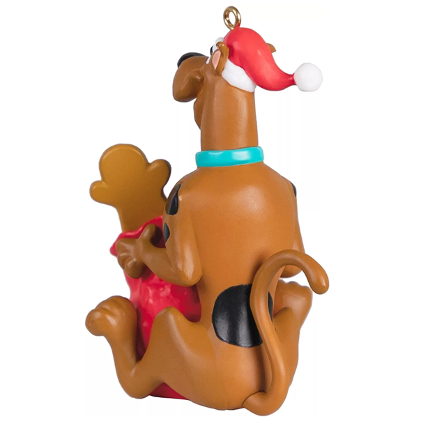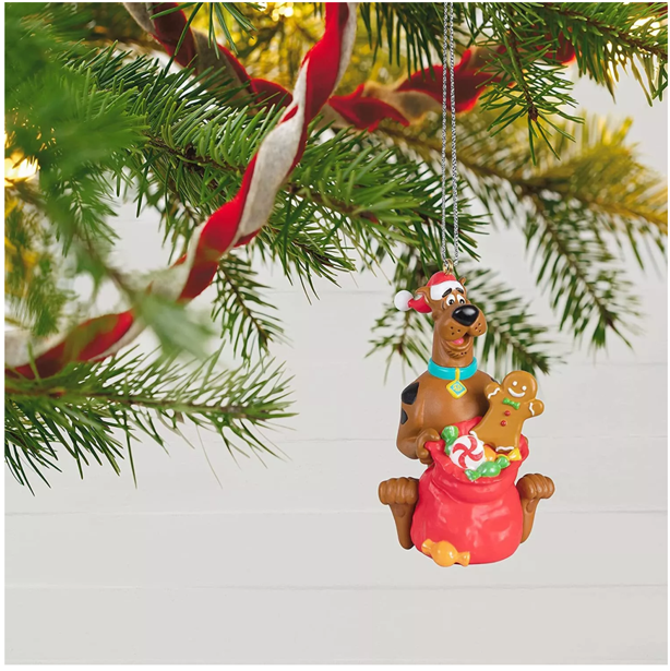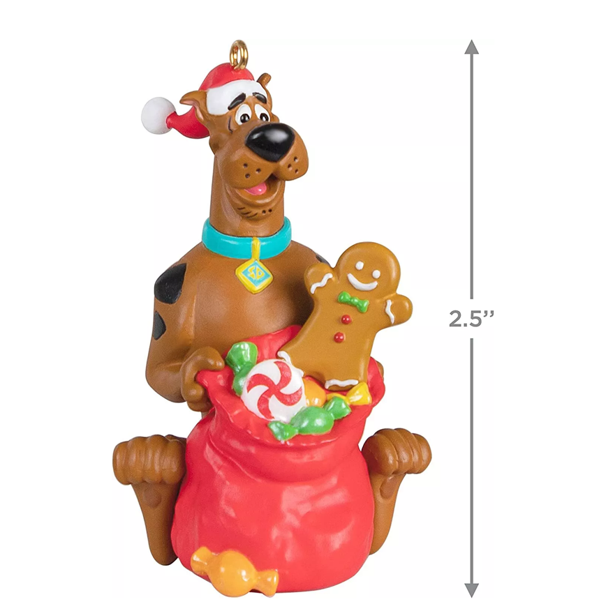 The beloved mystery-solving canine sports a Santa hat and holds a red sack packed with gingerbread man cookies and candy in this fun Christmas tree ornament.