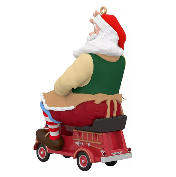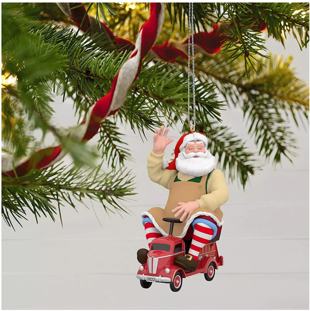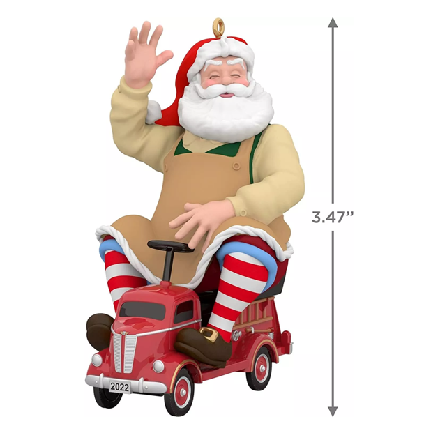 This playful Christmas tree ornament features the jolly old elf taking his creation for a spin around the toy factory. Year dated 2022.