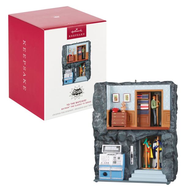 This Christmas tree ornament features Batman and Robin in their secret Super Hero headquarters from the 1966 classic TV series "Batman," complete with light, motion, dialogue and sound effects from the show (battery-operated).
