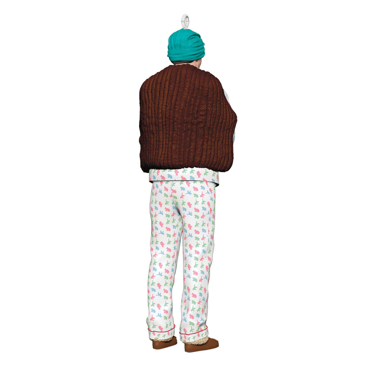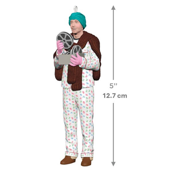 Relive the hilarious scene from the classic holiday movie "National Lampoon's Christmas Vacation" with this Christmas tree ornament featuring Clark, dressed in pajamas and layered with gloves, a fur stole and a women's hair turban for warmth, as he discovers old family movies while trapped in the attic.