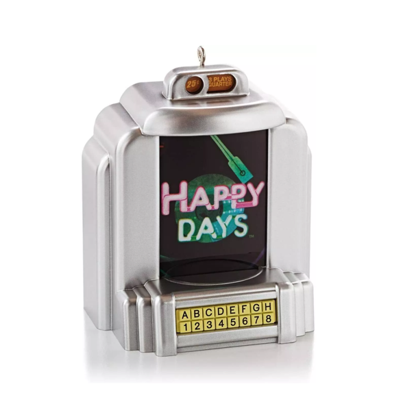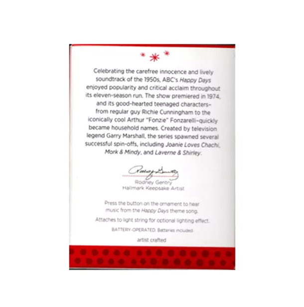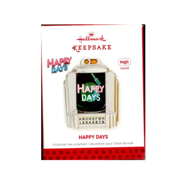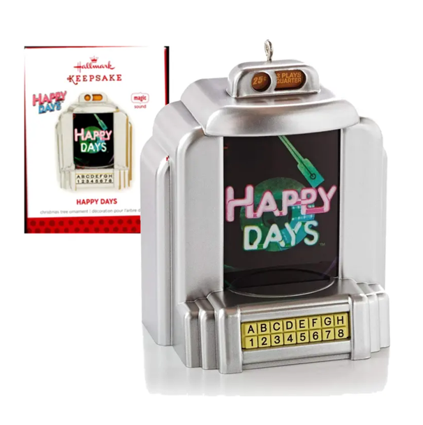 This collectible Hallmark Keepsake released in 2013 is powered by three (3) x LR44 batteries (included) and with the press of a button on the jukebox it plays music from the Happy Days theme song. It also can be attached to a string light to create an optimal lighting effect. The decoration is new and comes in the original sealed box. Get in fast because these are scarce and current stock won't last!