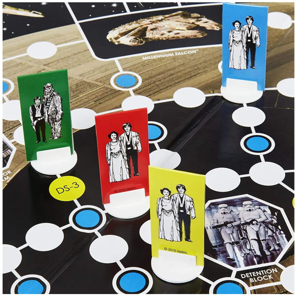Players are challenged to help Luke Skywalker, Princess Leia, Han Solo, and Chewbacca escape to freedom. The spinner spins out players' moves, but they must decide what passageways to follow. Will they take shortcuts that risk encounters with the Force? The first player to fight their way through TIE Fighters and reach the Rebel Base wins! Handle the game with respect, and it won't disappoint you!