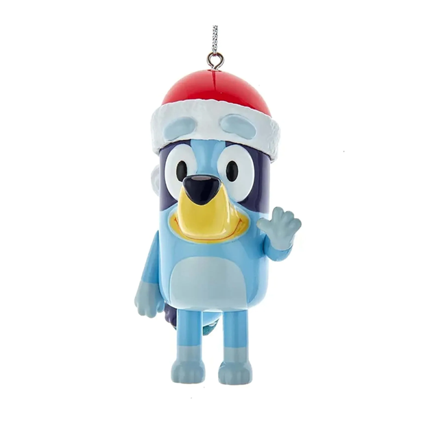 This ornament features Bluey™, a Blue Heeler puppy. Bluey™ is wearing a red and white Santa hat and he is waving hello! Officially-licensed Bluey™ product