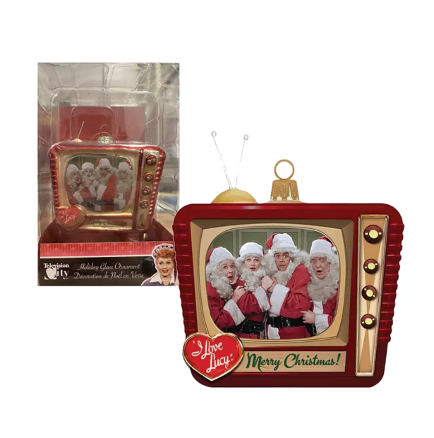 This Kurt Adler Glass I Love Lucy TV Ornament is a fun and festive addition to any holiday décor. Features a retro-style television set with scene from the classic I Love Lucy Christmas special, with Lucy, Ricky, Ethel and Fred all dressed up as Santa Claus with "Merry Christmas" written underneath.