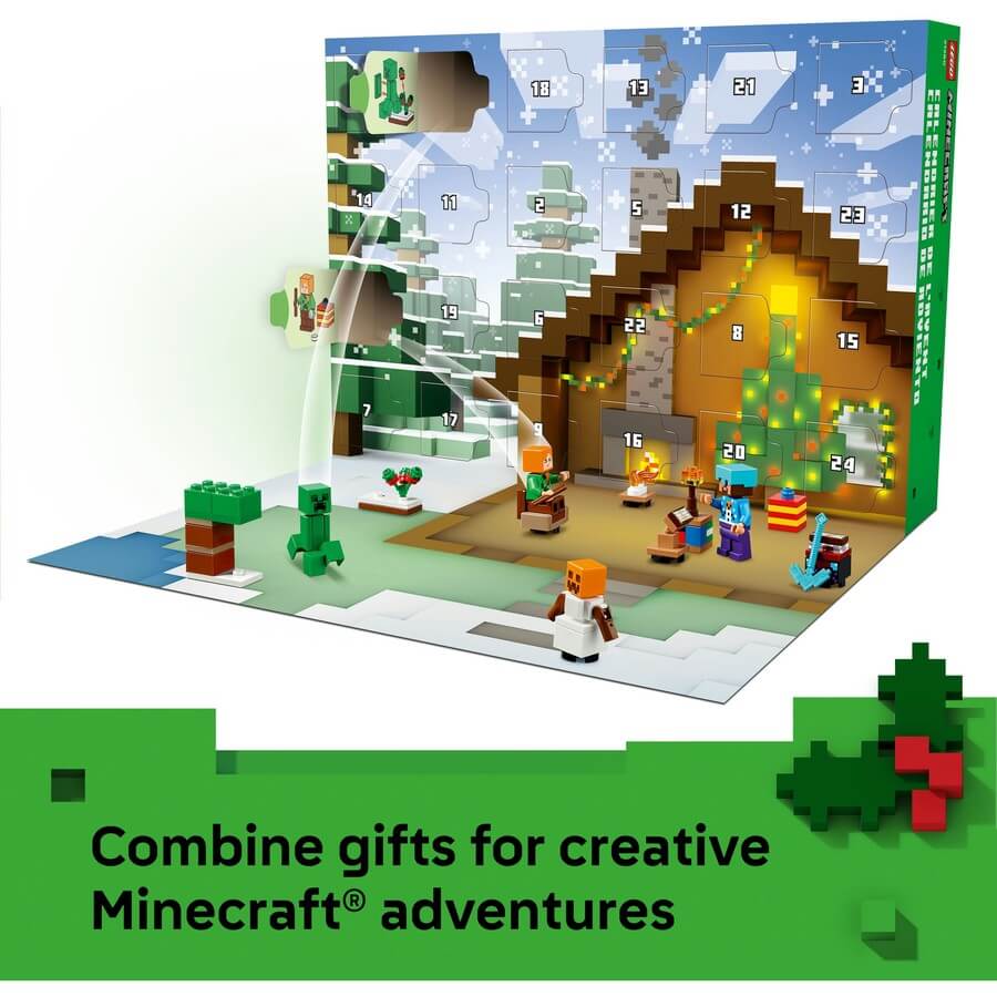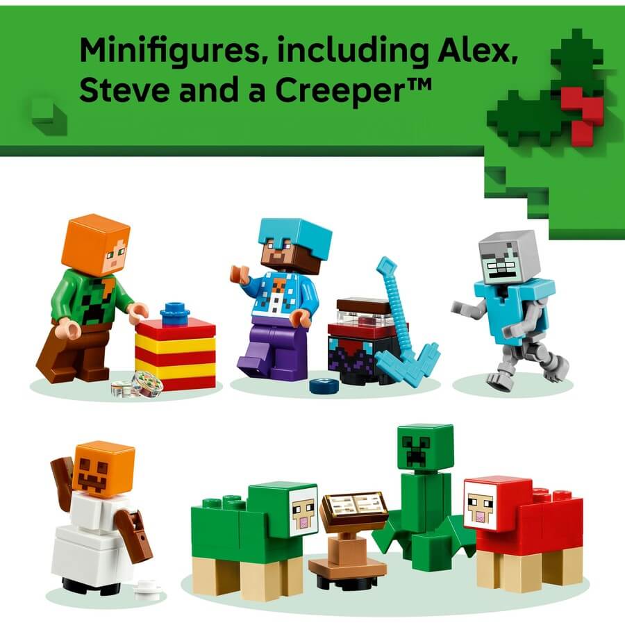 Behind each of the 24 doors is a daily gift for kids to discover throughout the lead up to Christmas. Minifigures include Alex wearing a Creeper sweater, Steve wearing a snowman sweater and diamond helmet, plus many familiar mobs and characters.
