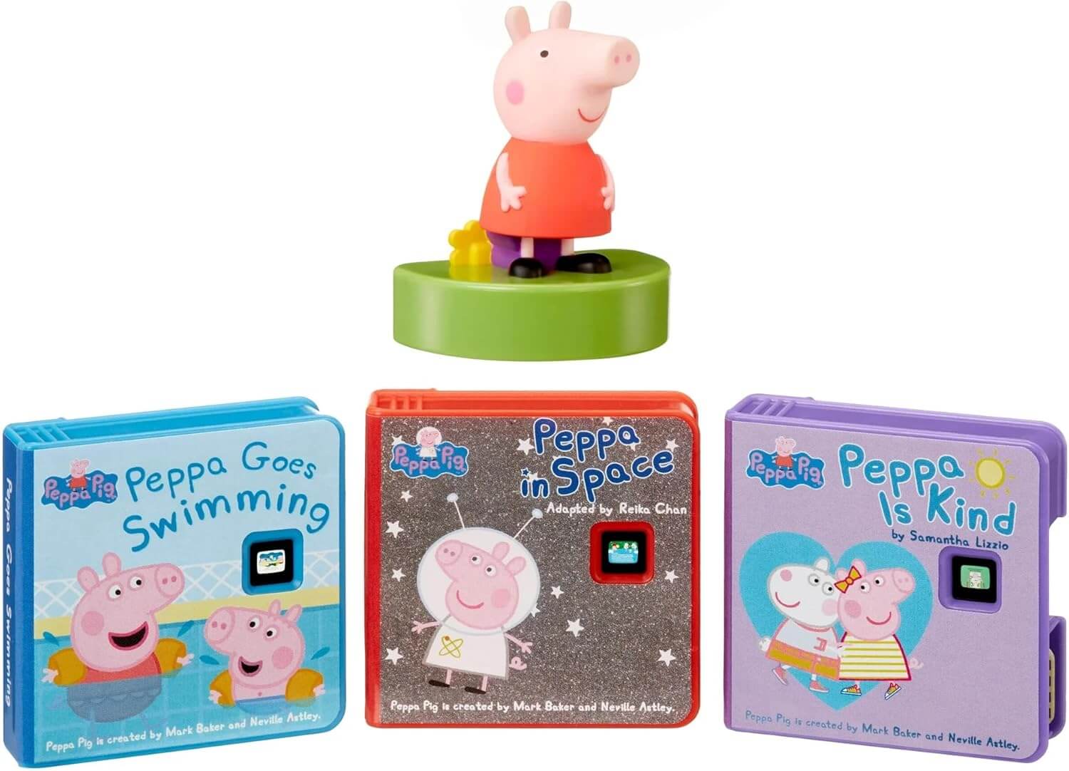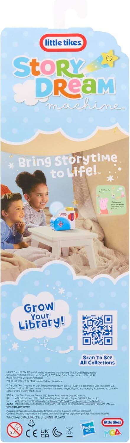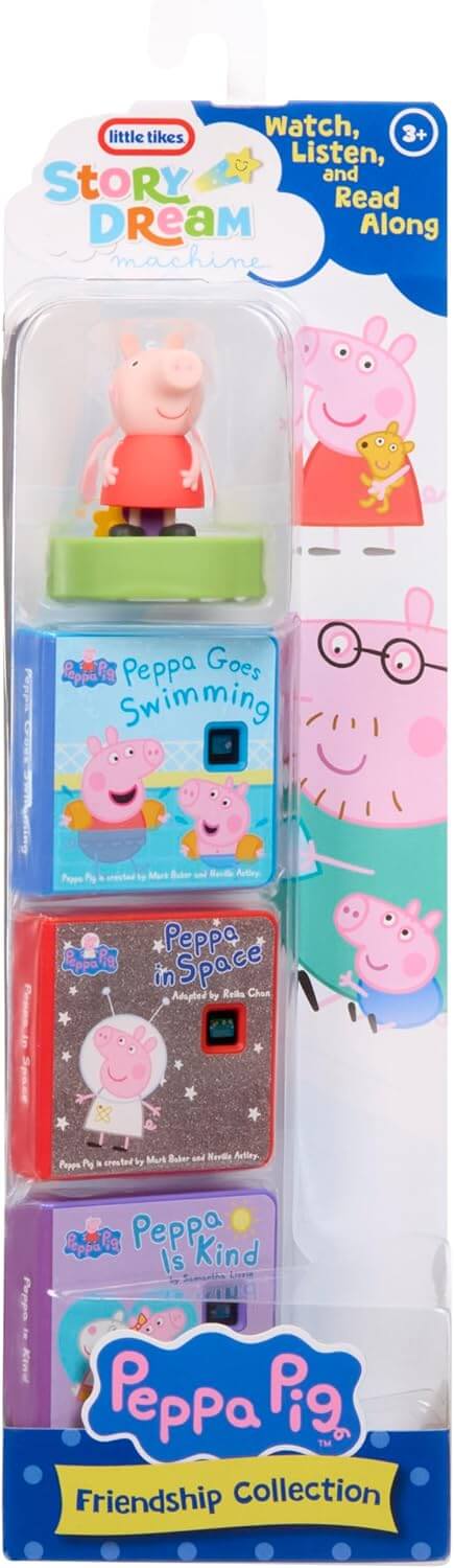 This special edition Peppa Pig collection for the Little Tikes Story Dream Machine includes 3 Peppa Pig stories and 1 Peppa Pig character that adds light effects in nightlight mode.