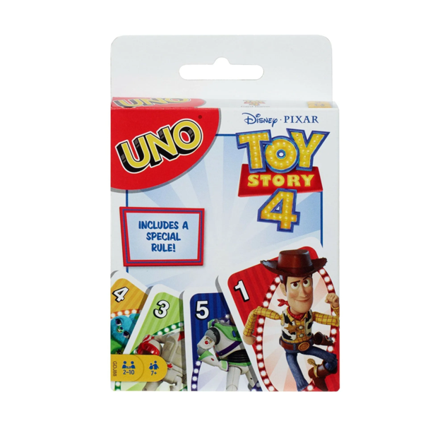Based on the highly anticipated family film, this UNO deck features cards with images of your favorite Toy Story 4 characters, plus the Duke Caboom Wild Card! When played, Duke will "crash" into two other players of your choice.