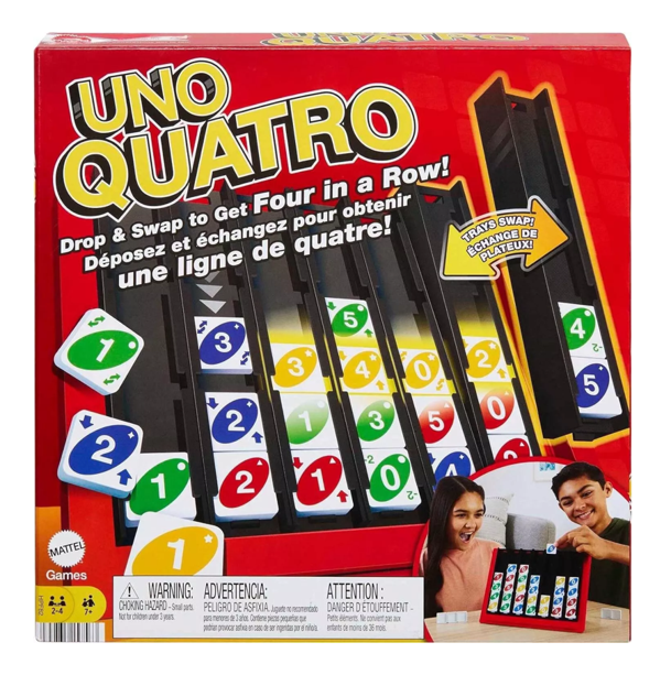 Fans of UNO card games will love the UNO Quatro family game which combines the challenge of getting four-in-a-row with the strategy of matching colour or number.