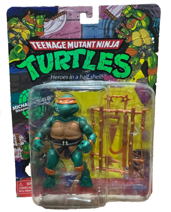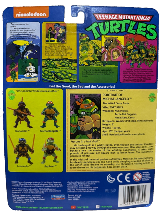 Michaelangelo is a party reptile. Even though the sinister Shredder may be slicing his way through the manhole cover, Mike stays cool.....cool because he's the master of the whirling nunchucks. It takes 8 pounds per square inch to break bone. The nunchucks generate ninety!