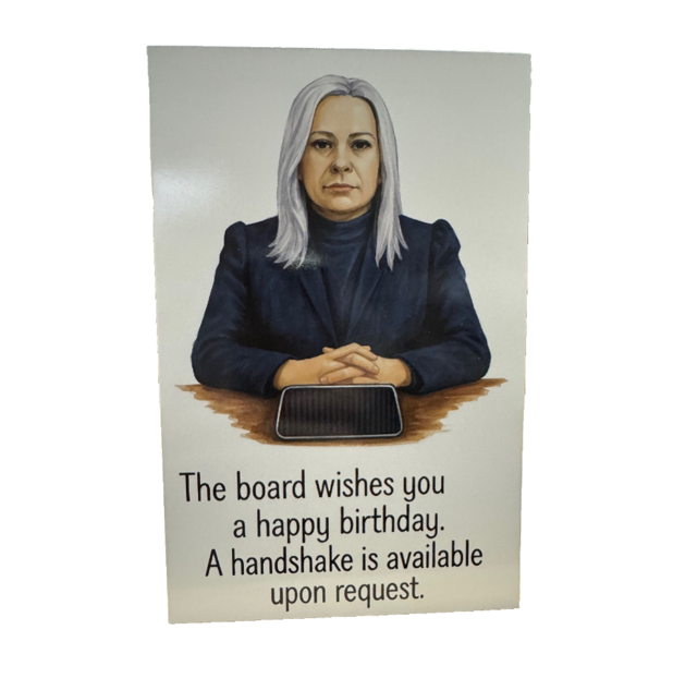 This unique birthday card features Miss Cobel and the board wishing you a corporate Happy Birthday. Perfect for any fan of the critically acclaimed psychological thriller series Severance.