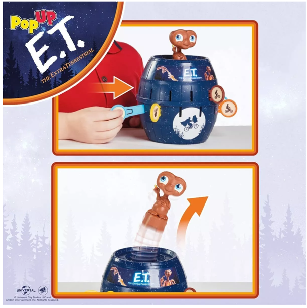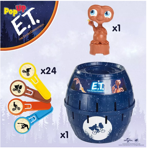 Pop Up E.T. is a great kids' game with ET hiding in a barrel. Take turns sliding your sticks into the slots, but don't disturb E.T! One false move and whoosh! He'll spring out of the barrel and you're out. Who knows when he'll pop up next?
